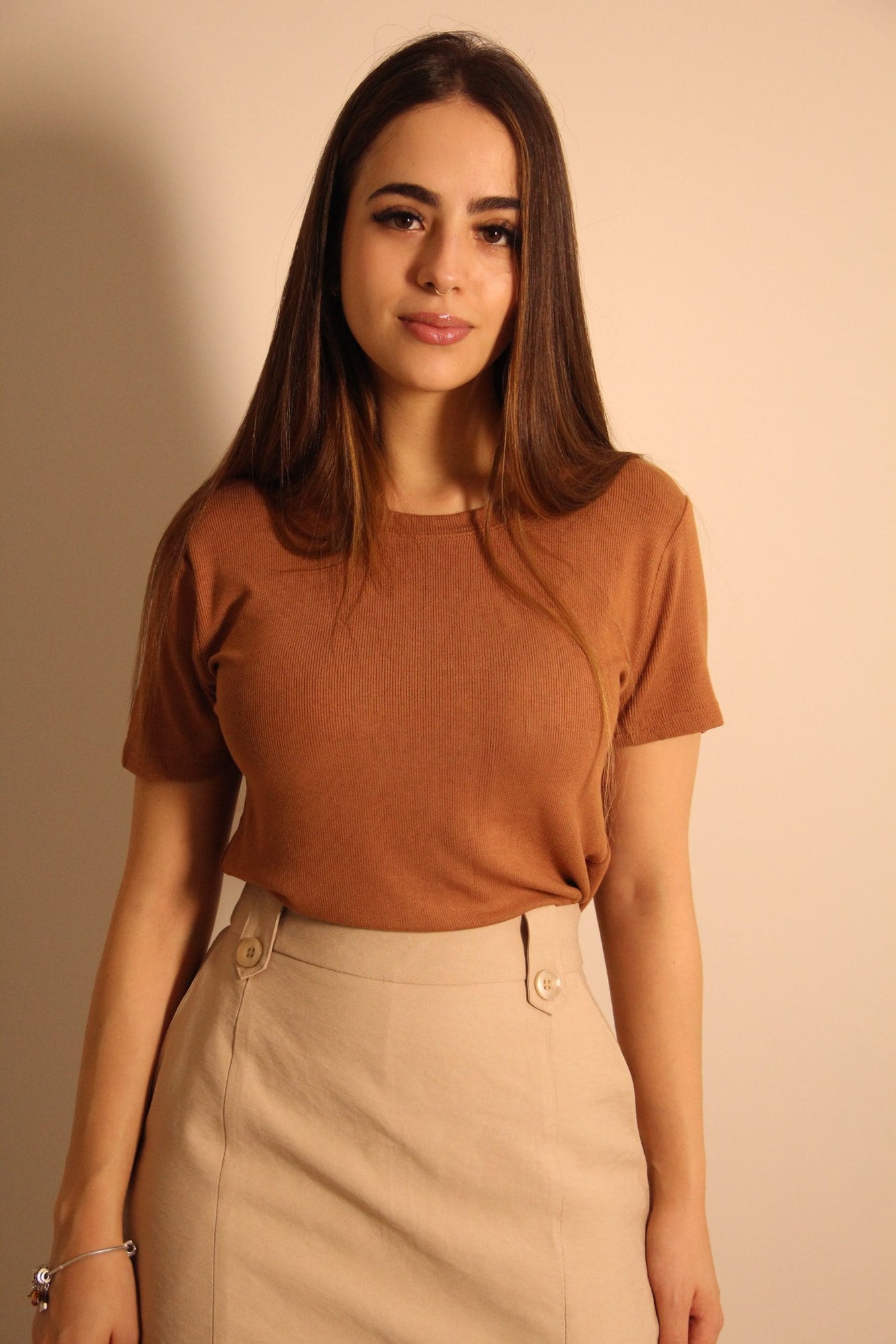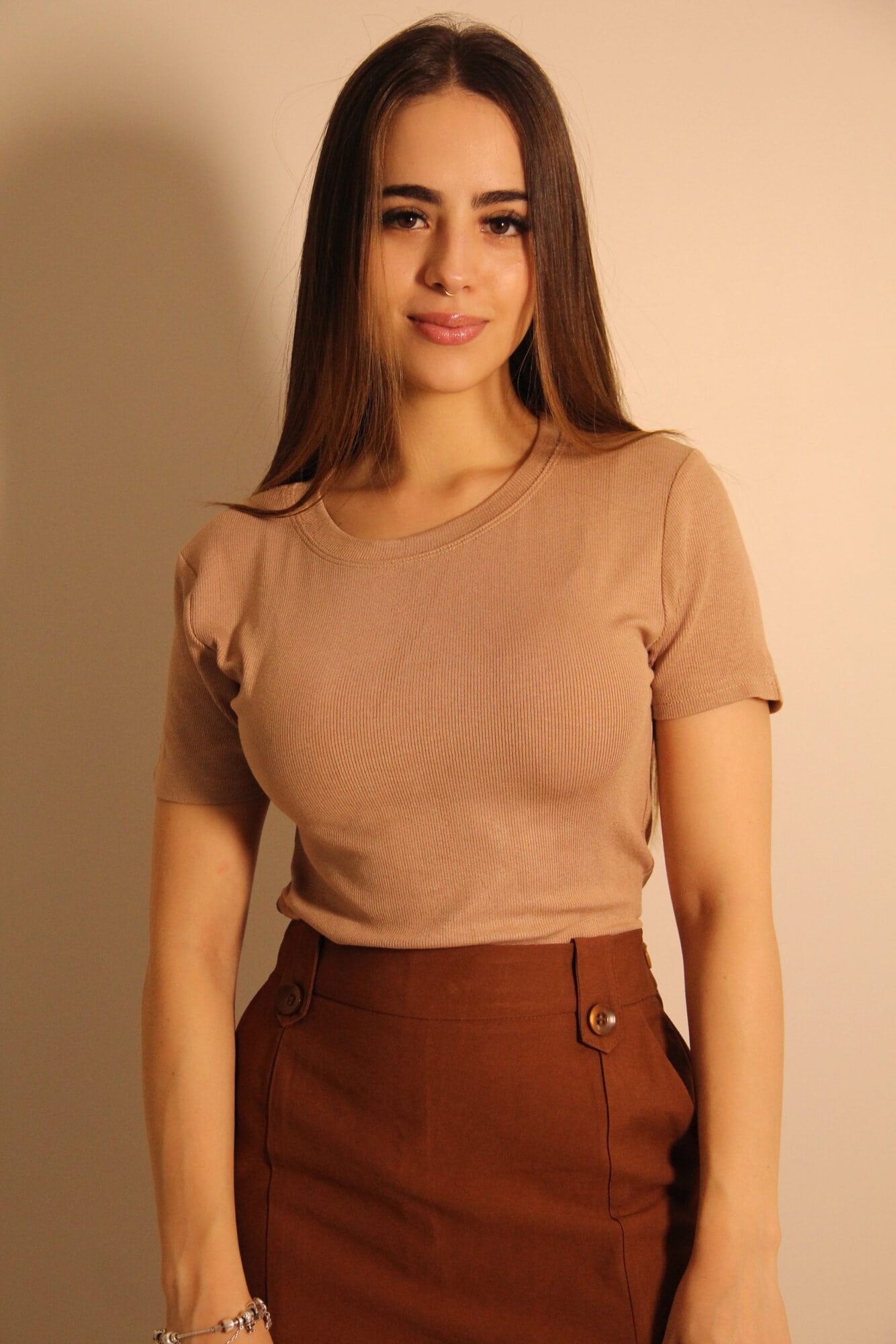 Essa blusinha é um modelo básico, confeccionada em tecido canelado com bastante elastano, que proporciona leve textura, ótimo ajuste ao corpo e um toque macio, Possui gola redonda clássica, mangas curtas e um caimento justo que valoriza a silhueta sem comprometer o conforto. Seu comprimento atinge o cós da calça, tornando-a ideal para compor desde looks casuais até produções mais sofisticadas.