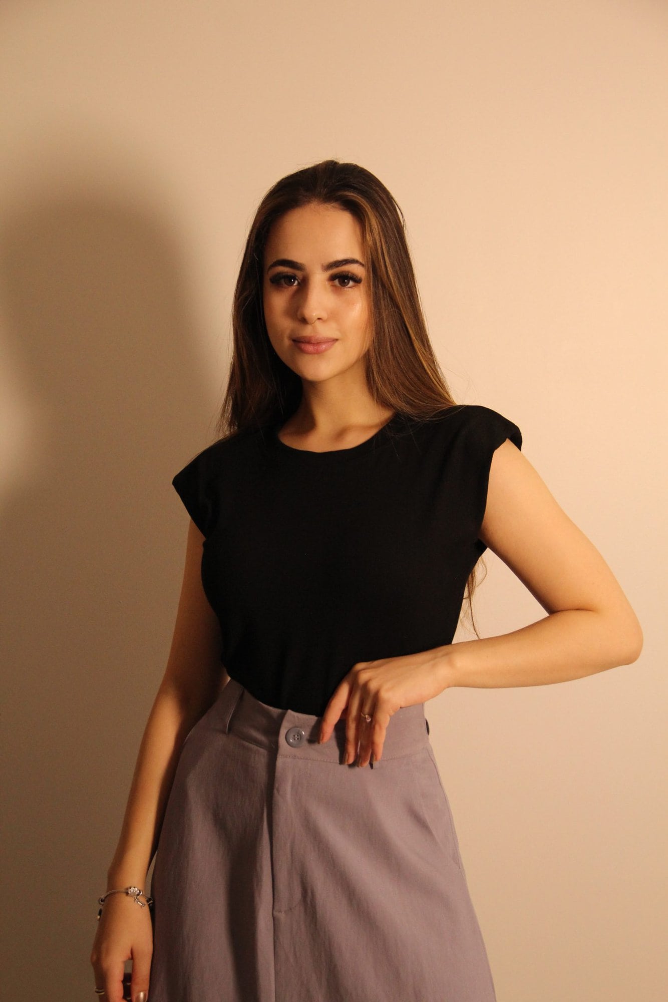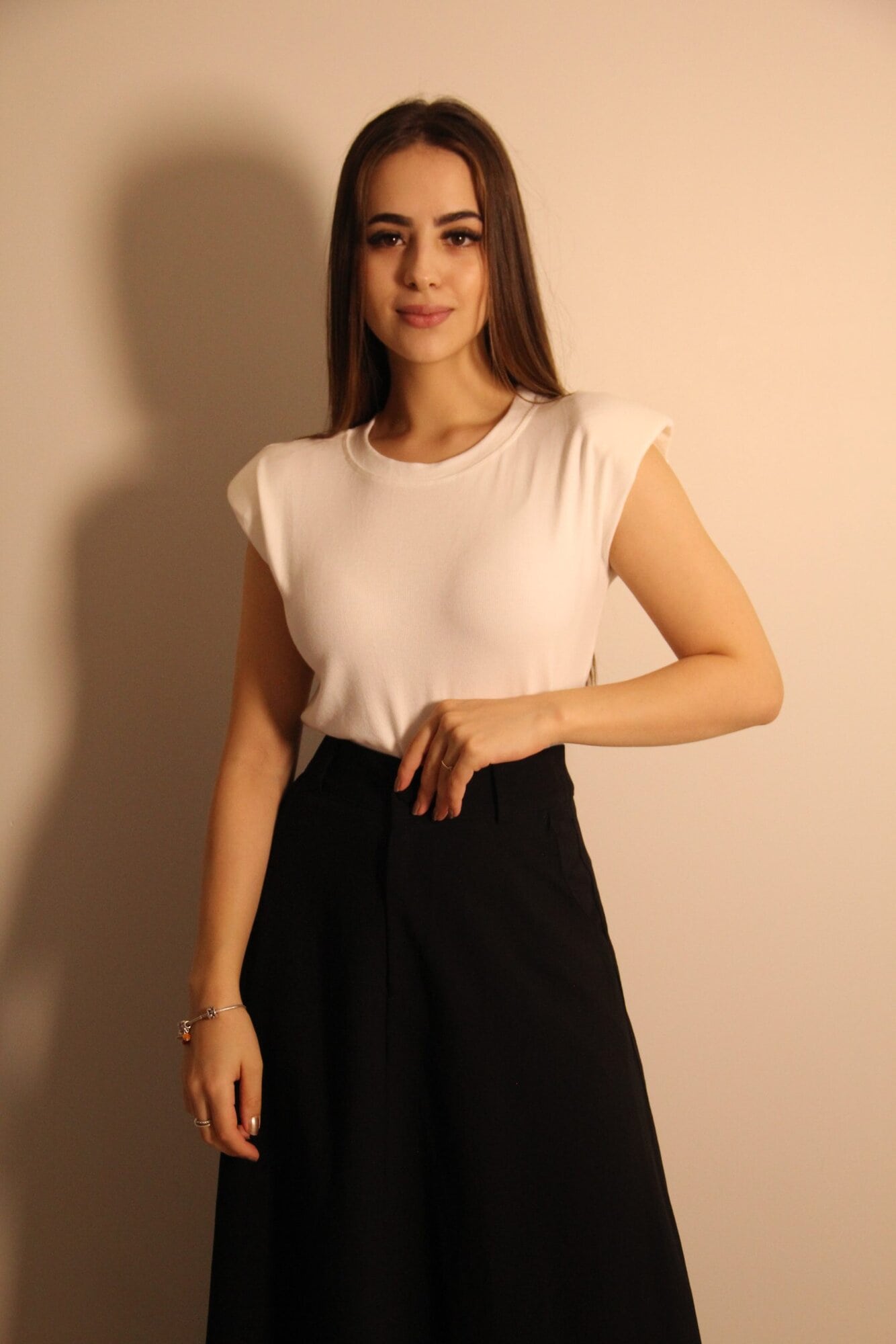 Essa blusinha é uma peça moderna e elegante, com um corte minimalista e sofisticado. Ela possui modelagem reta e um caimento levemente solto, proporcionando conforto e versatilidade. O tecido é maleável e macio. Além disso, conta com ombreiras finas e macias, que adicionam uma leve estrutura à peça, trazendo um toque de elegância sem comprometer o conforto. A gola redonda mantém o visual clássico.