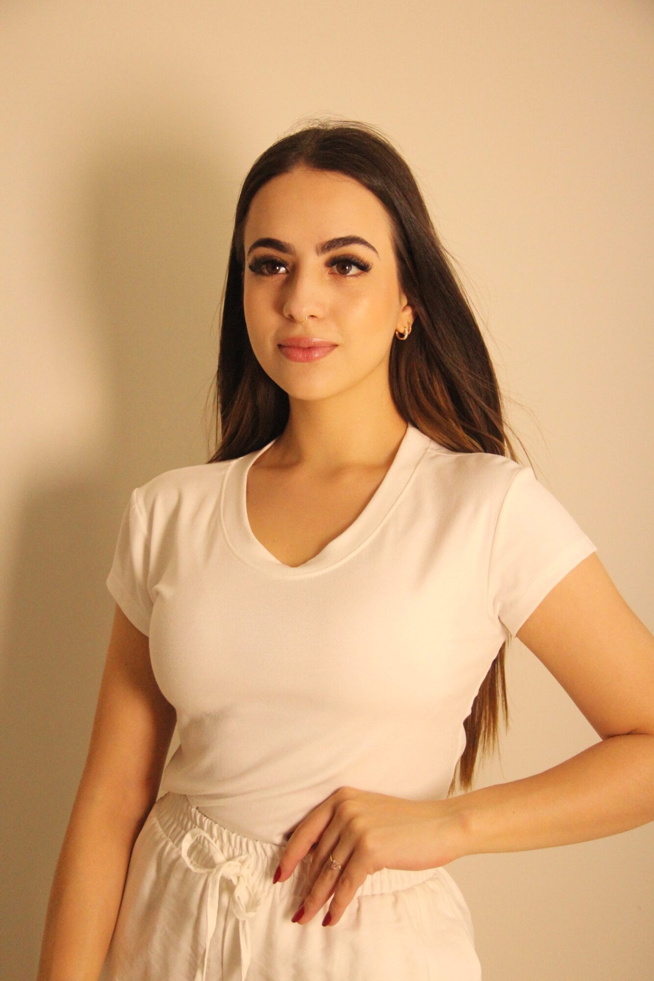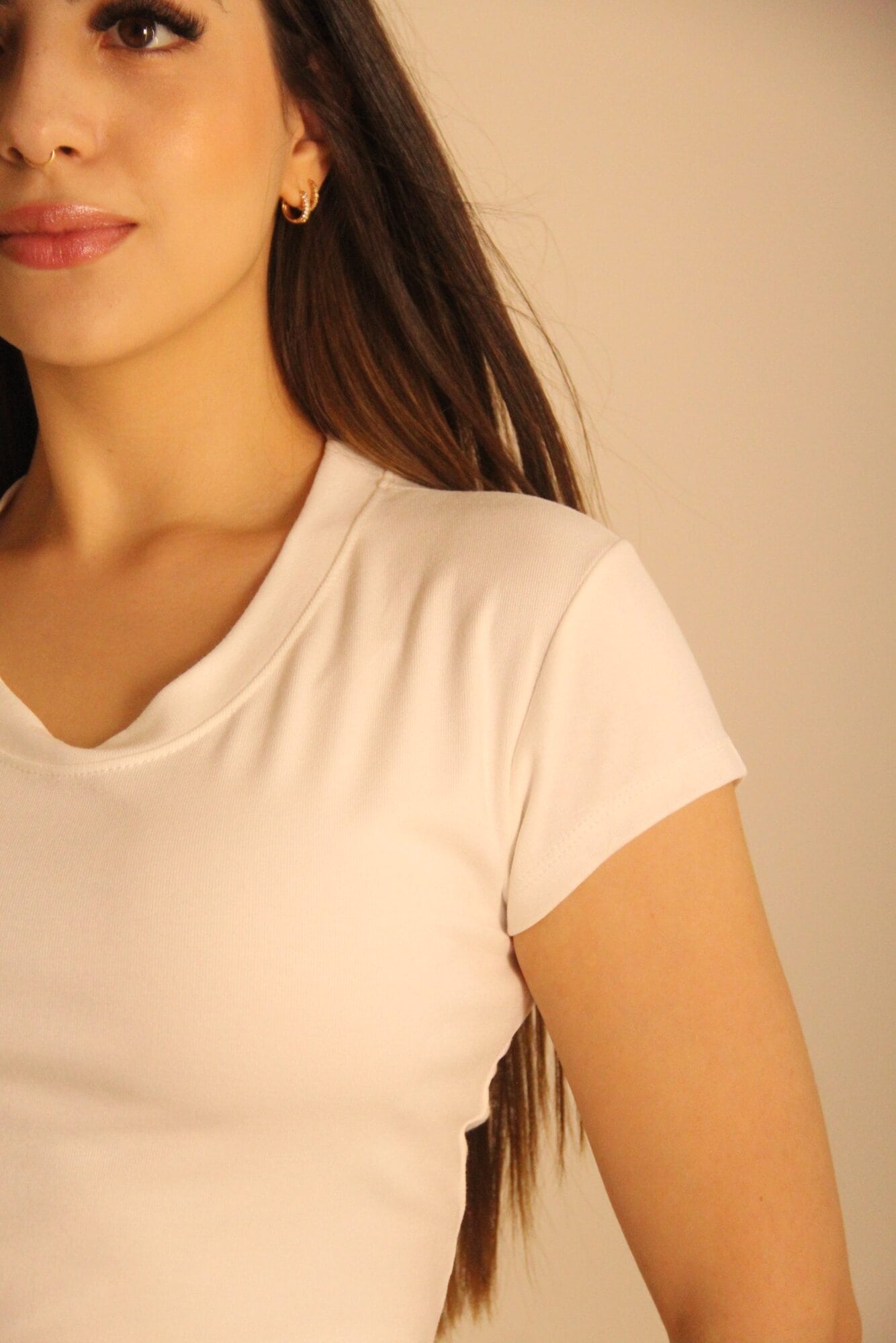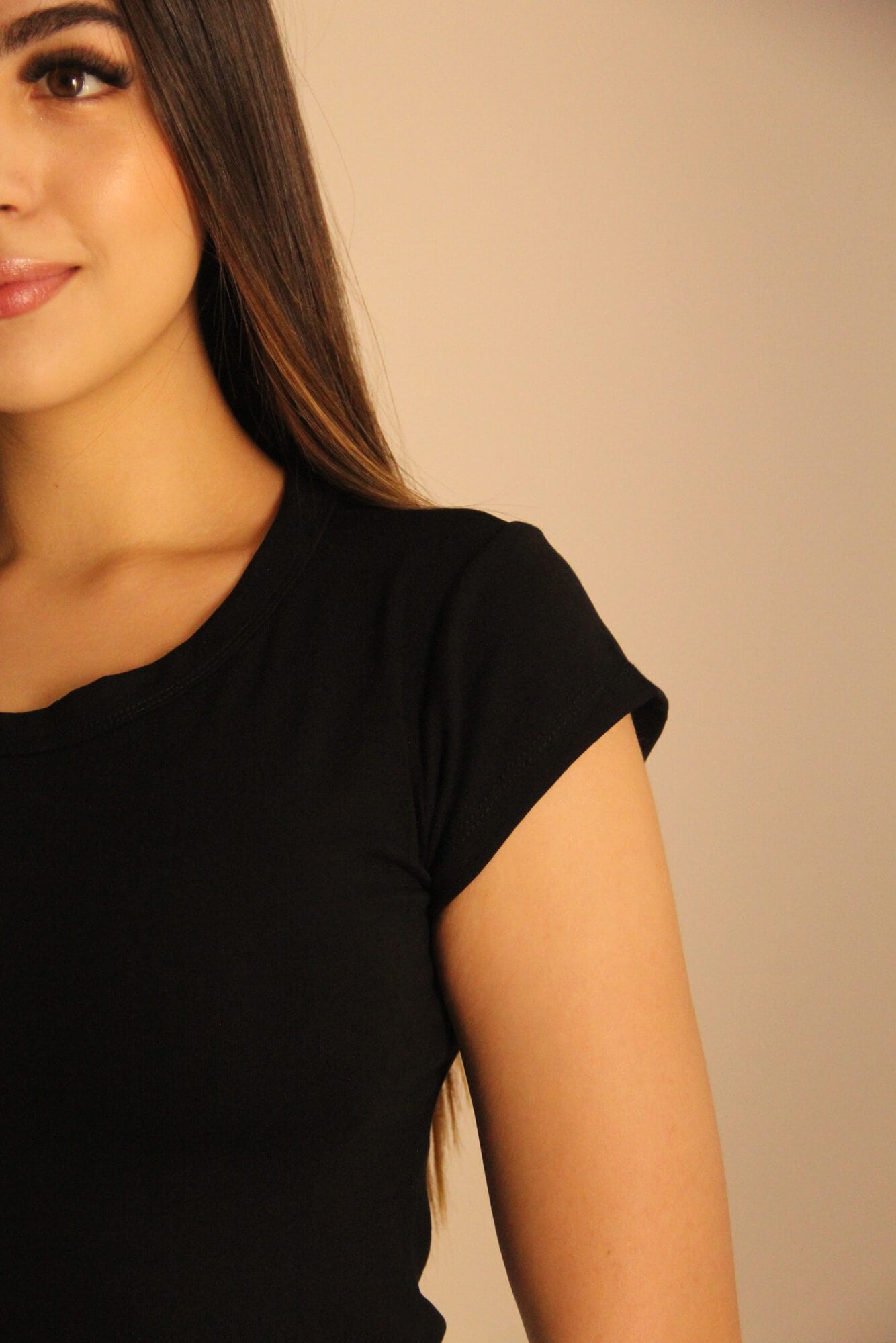 Blusa de manga curta com gola redonda, com manga curta, confeccionada em tecido macio e maleável com elastano. Possui modelagem ajustada ao corpo, proporcionando conforto e elegância. Seu comprimento alcança o cós da calça, garantindo um caimento moderno e versátil para diversas combinações.