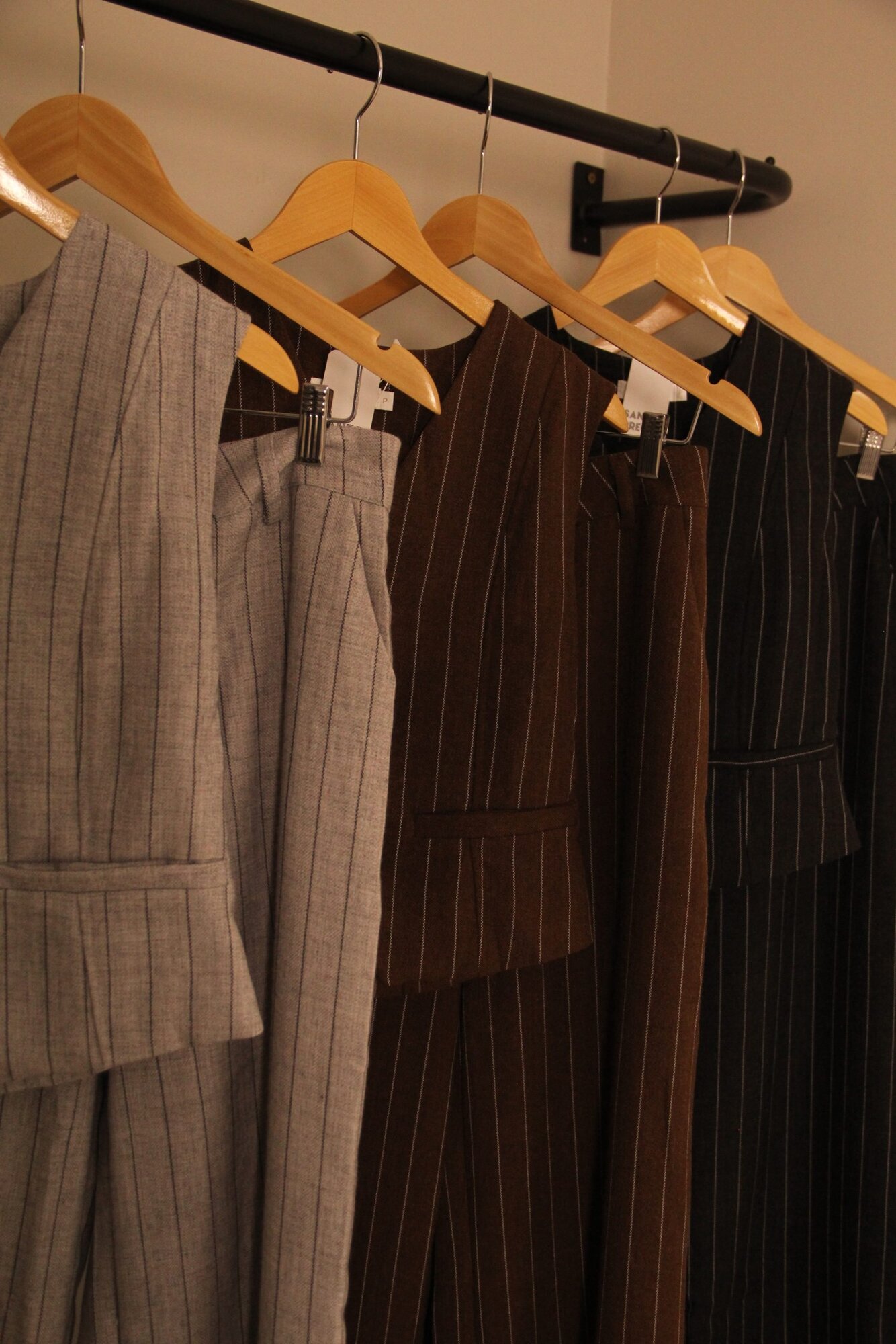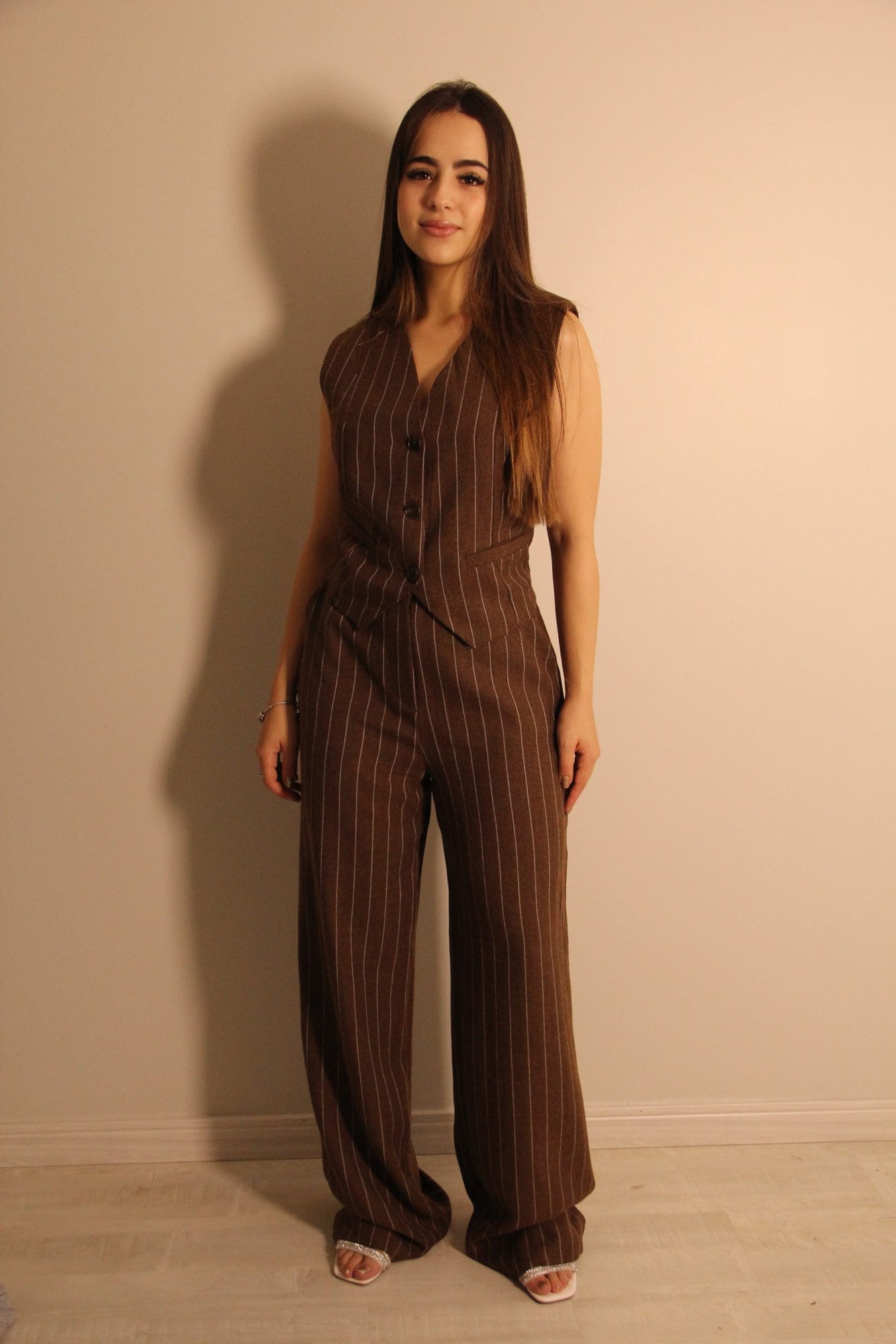 Este conjunto elegante é composto por um colete e uma calça de alfaiataria com um padrão clássico de risca de giz. o conjunto apresenta um corte refinado e estruturado, ideal para um visual moderno e alinhado.