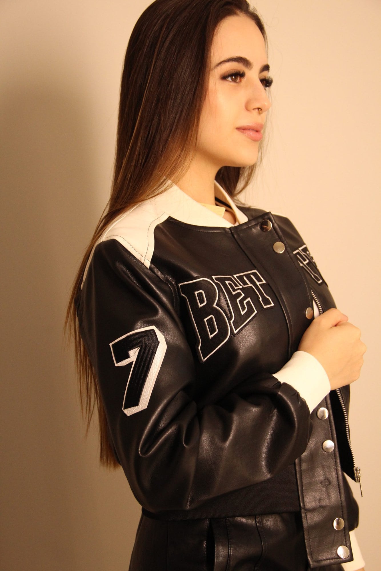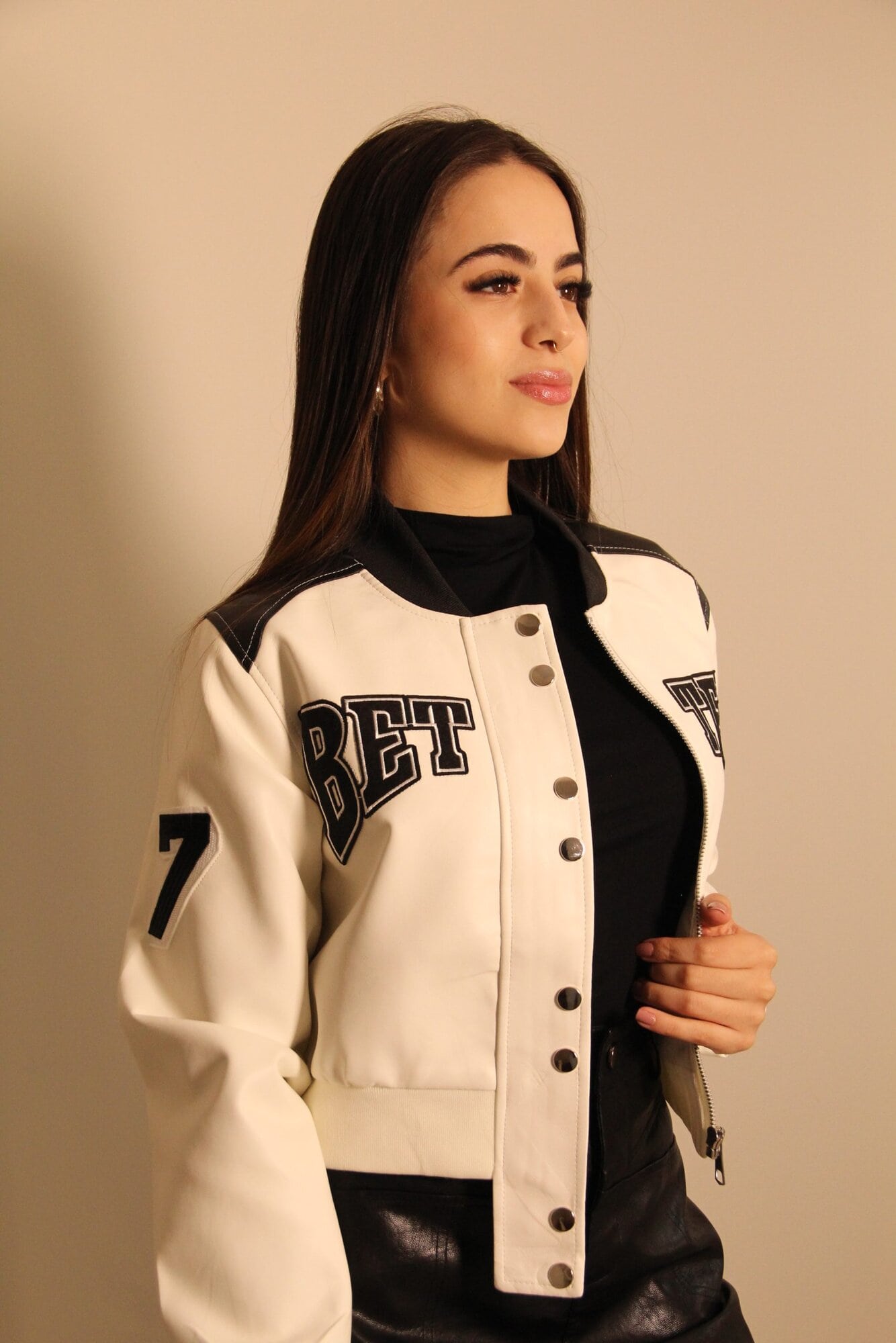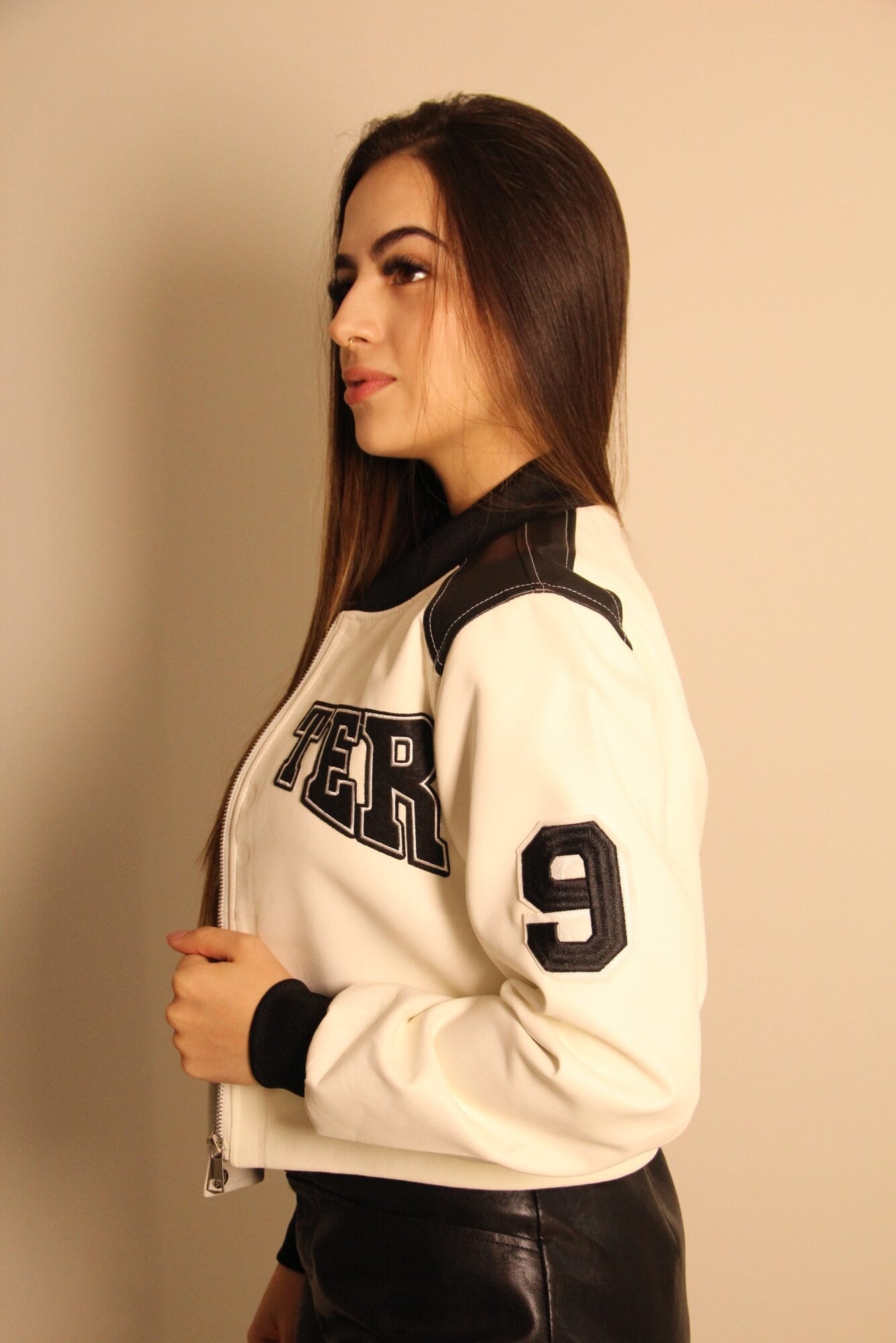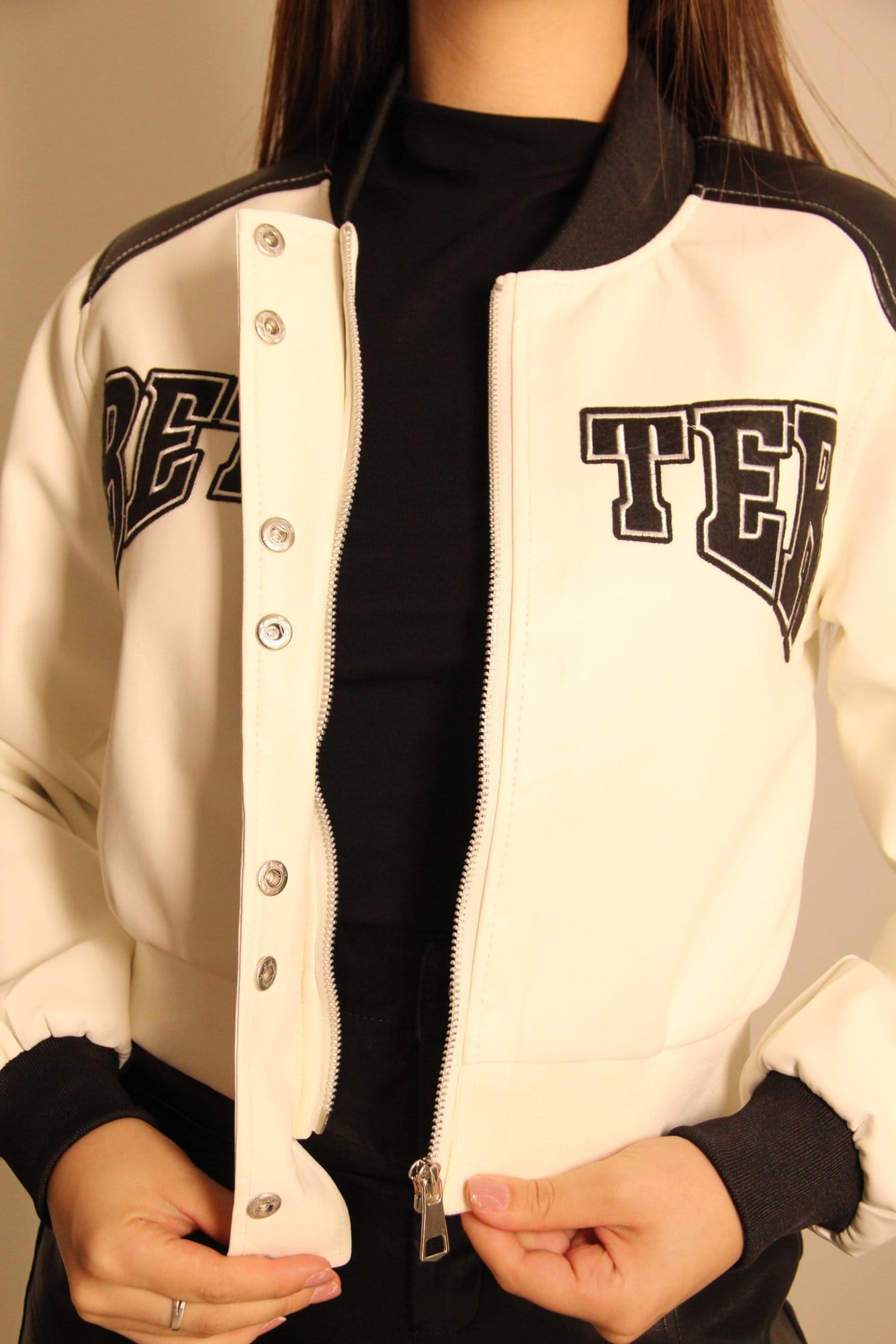 Jaqueta de couro sintético com design imponente e estética esportiva. Possui fechamento frontal por zíper prateado, complementado por uma camada extra com botões de pressão, criando um efeito de fechamento duplo no peito. Nas mangas o detalhe de números para destacar ainda mais a estética esportiva.