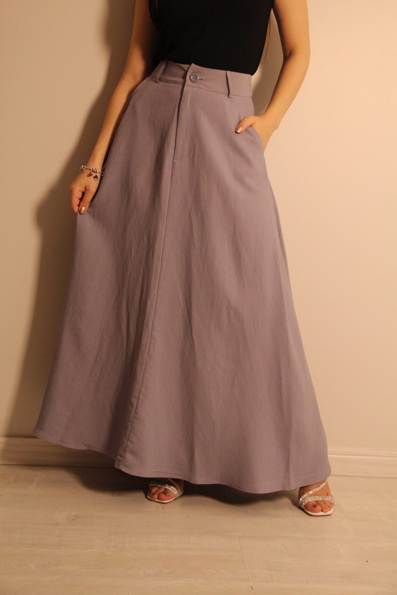 A saia possui um design sofisticado e elegante, destacando-se pelo seu comprimento longo e modelagem de cintura alta. Feita em alfaiataria, seu tecido estruturado garante um caimento impecável e refinado. O fechamento frontal com botão e zíper proporciona um acabamento clássico e discreto. Possui um detalhe de costura no meio, que contribui para um visual alongado e elegante. Além disso, a amplitude da barra adiciona movimento e leveza, tornando a saia uma opção versátil para diversas ocasiões.